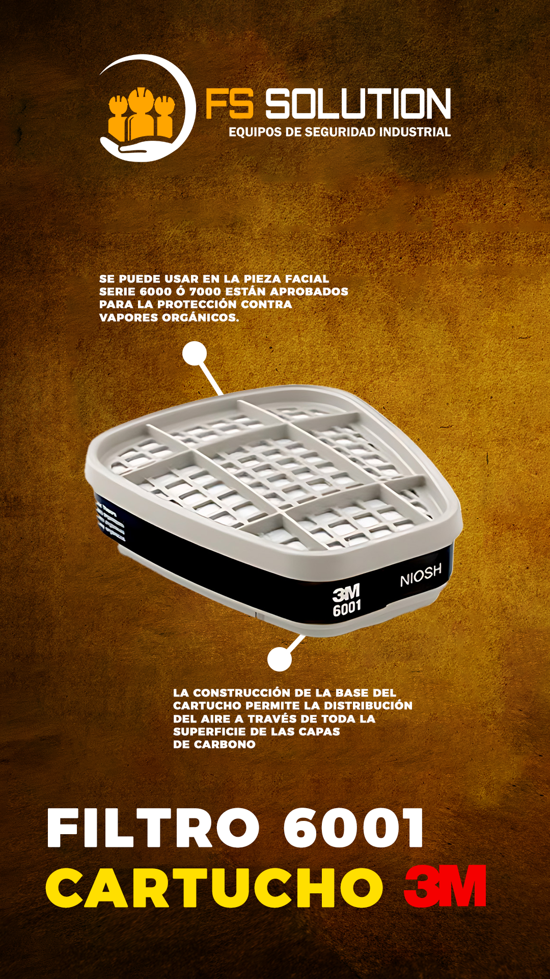 El Filtro 3M 6001 está diseñado para brindar protección respiratoria contra vapores orgánicos, como solventes industriales, pinturas, pesticidas y adhesivos. Este cartucho está aprobado por NIOSH como cartucho de tipo OV (vapores orgánicos) y es compatible con los respiradores 3M de media y cara completa con conexión tipo bayoneta.