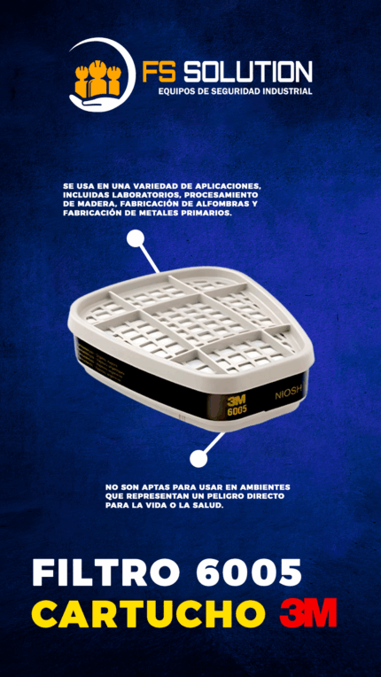 El filtro 3M 6005 está diseñado específicamente para brindar protección respiratoria frente a vapores de formaldehído y otros vapores orgánicos, en entornos donde estos contaminantes están presentes. Su diseño de cartucho liviano y compatible con respiradores reutilizables 3M con conexión tipo bayoneta lo convierte en una solución eficaz y práctica para tareas industriales exigentes.