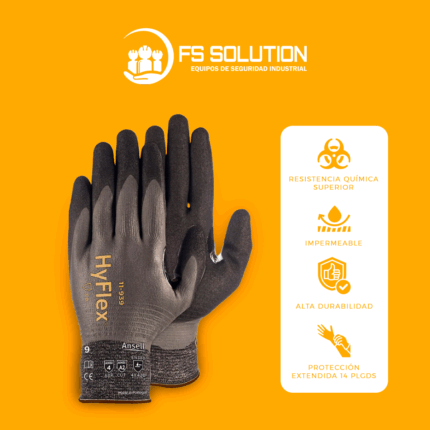 El modelo HyFlex® 11-939 está fabricado con un forro tejido sin costuras de nailon y Dyneema®, combinado con un recubrimiento de nitrilo espumado en la palma, lo que le proporciona alta resistencia a la abrasión, excelente agarre en ambientes aceitosos y protección contra cortes de nivel intermedio. Su diseño ergonómico y flexible permite una destreza superior, incluso en trabajos que requieren manipulación de piezas pequeñas o afiladas.